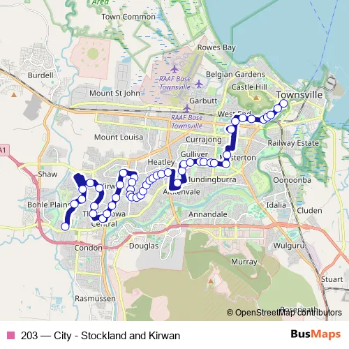 The first stop of the 203 bus route is Golf Links Dr at Nineteenth Avenue and the last stop is Townsville City bus hub Stop B. 203 (City - Stockland and Kirwan) is operational during everyday.