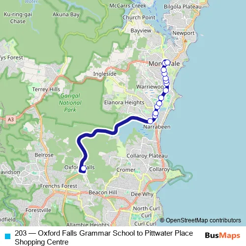 Bus 203 - Oxford Falls Grammar School to Pittwater Place Shopping Centre in Sydney: Stops & Timetable