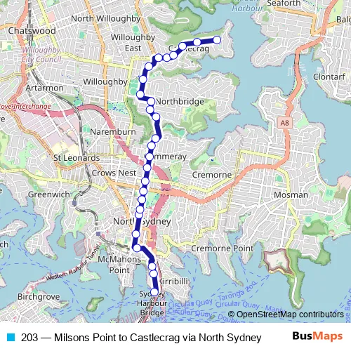Click here to view the nearest 203 - Milsons Point to Castlecrag via North Sydney bus stop.