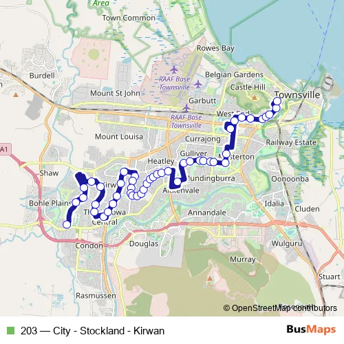 The first stop of the 203 bus route is Golf Links Dr near Nineteenth Ave and the last stop is Townsville City (Stanley Street). 203 (City - Stockland - Kirwan) is operational during everyday.