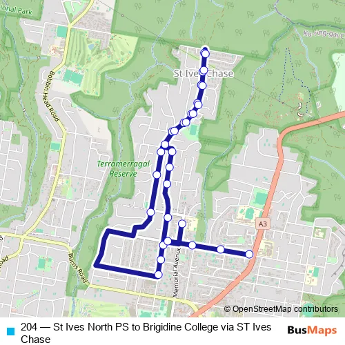 The first stop of the 204 bus route is St Ives North Public School, Memorial Av and the last stop is Woodbury Rd Before Mona Vale Rd. 204 (St Ives North PS to Brigidine College via ST Ives Chase) is operational during on weekdays.