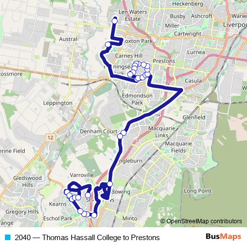 The first stop of the 2040 bus route is Thomas Hassall Anglican College, Kingsford Smith Av and the last stop is Spitfire Dr At Sunderland Dr. 2040 (Thomas Hassall College to Prestons) is operational during on weekdays.