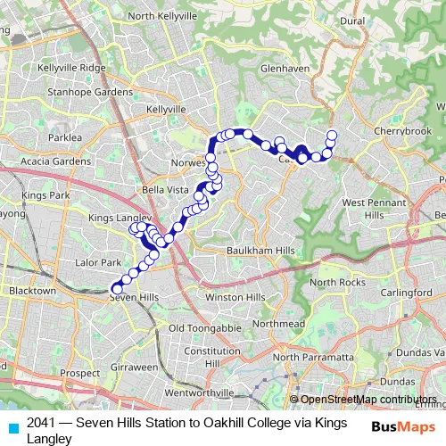 The first stop of the 2041 bus route is Seven Hills Station, Stand A and the last stop is Oakhill College, Old Northern Rd. 2041 (Seven Hills Station to Oakhill College via Kings Langley) is operational during on weekdays.