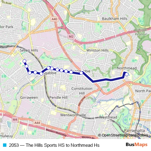 Click here to view the nearest 2053 - The Hills Sports HS to Northmead Hs bus stop.