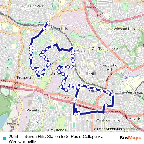 The first stop of the 2056 bus route is Seven Hills Station, Stand B and the last stop is St Pauls Catholic College, Old Prospect Rd. 2056 (Seven Hills Station to St Pauls College via Wentworthville) is operational during on weekdays.