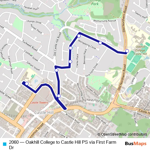 The first stop of the 2060 bus route is Oakhill College, Old Northern Rd and the last stop is Castle Hill Public School, Les Shore Pl. 2060 (Oakhill College to Castle Hill PS via First Farm Dr) is operational during on weekdays.