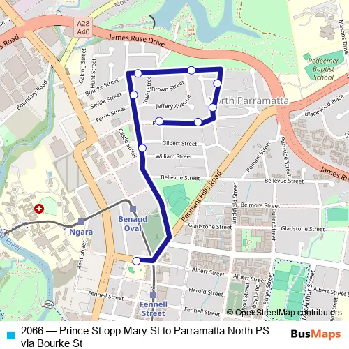 The first stop of the 2066 bus route is Prince St Opp Mary St and the last stop is Parramatta North Public School, Albert St. 2066 (Prince St opp Mary St to Parramatta North PS via Bourke St) is operational during on weekdays.