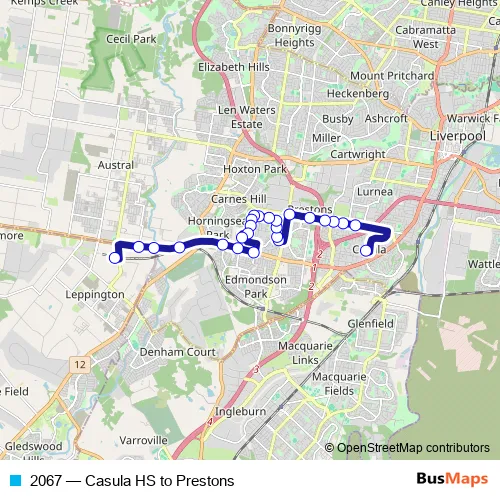 The first stop of the 2067 bus route is Casula High School, School Grounds and the last stop is Leppington Station, Stand A. 2067 (Casula HS to Prestons) is operational during on weekdays.