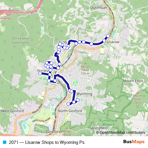 The first stop of the 2071 bus route is Railway Cres Opp Dora St and the last stop is Wyoming Public School, Maidens Brush Rd. 2071 (Lisarow Shops to Wyoming Ps) is operational during on weekdays.