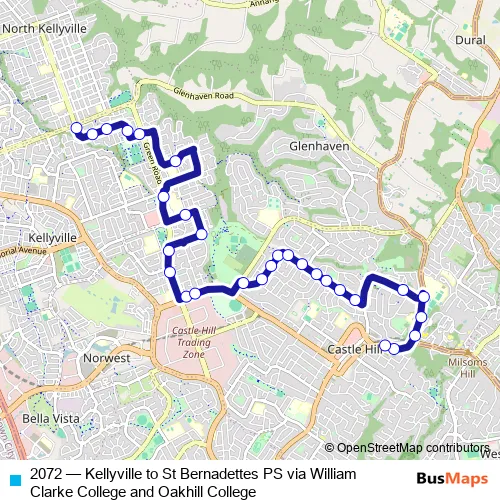 The first stop of the 2072 bus route is James Mileham Dr After Samantha Riley Dr and the last stop is St Bernadette's Primary School, Old Northern Rd. 2072 (Kellyville to St Bernadettes PS via William Clarke College and Oakhill College) is operational during on weekdays.
