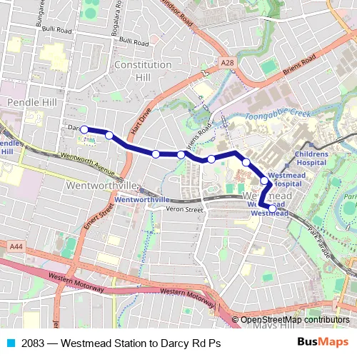 The first stop of the 2083 bus route is Alexandra Av Opp Westmead Station and the last stop is Darcy Road Public School, Darcy Rd. 2083 (Westmead Station to Darcy Rd Ps) is operational during on weekdays.