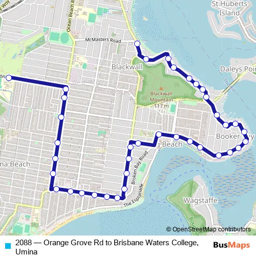 The first stop of the 2088 bus route is Blackwall Rd At Lalina Av and the last stop is Brisbane Secondary College, Veron Rd. 2088 (Orange Grove Rd to Brisbane Waters College, Umina) is operational during on weekdays.