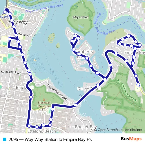 The first stop of the 2095 bus route is Woy Woy Station and the last stop is Empire Bay Public School, Empire Bay Dr. 2095 (Woy Woy Station to Empire Bay Ps) is operational during on weekdays.