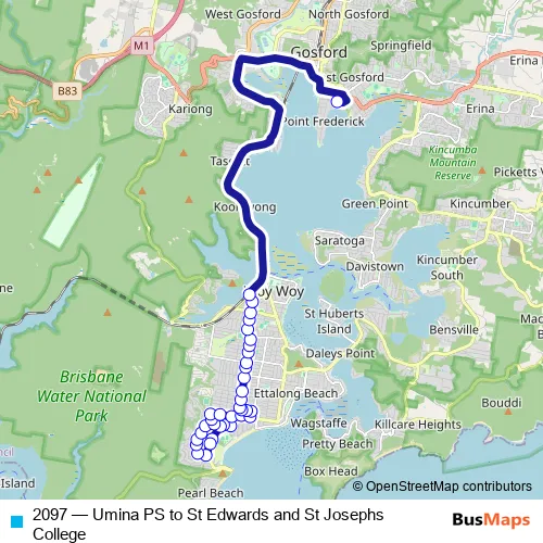 The first stop of the 2097 bus route is Umina Beach Public School, Horbart Av and the last stop is St Edwards High School, Russell Drysdale St. 2097 (Umina PS to St Edwards and St Josephs College) is operational during on weekdays.