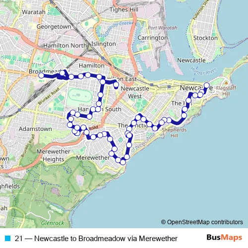The first stop of the 21 bus route is Customs House, Watt St and the last stop is Hunter School Of The Performing Arts, Lambton Rd. 21 (Newcastle to Broadmeadow via Merewether) is operational during everyday.