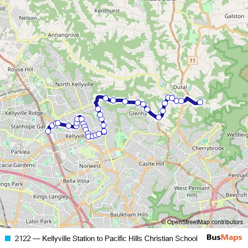 The first stop of the 2122 bus route is Kellyville Station, Guragura St, Stand C and the last stop is Pacific Hills Christian School Bus Bay, Quarry Rd. 2122 (Kellyville Station to Pacific Hills Christian School) is operational during on weekdays.