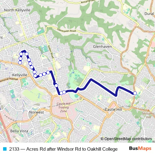The first stop of the 2133 bus route is Acres Rd Opp Spring Rd and the last stop is Oakhill College, Old Northern Rd. 2133 (Acres Rd after Windsor Rd to Oakhill College) is operational during on weekdays.