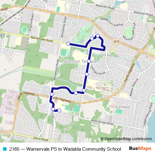 The first stop of the 2165 bus route is Warnervale Rd Opp Warnervale Public School and the last stop is Wadalba High School, Van Stappen Rd. 2165 (Warnervale PS to Wadabla Community School) is operational during on weekdays.