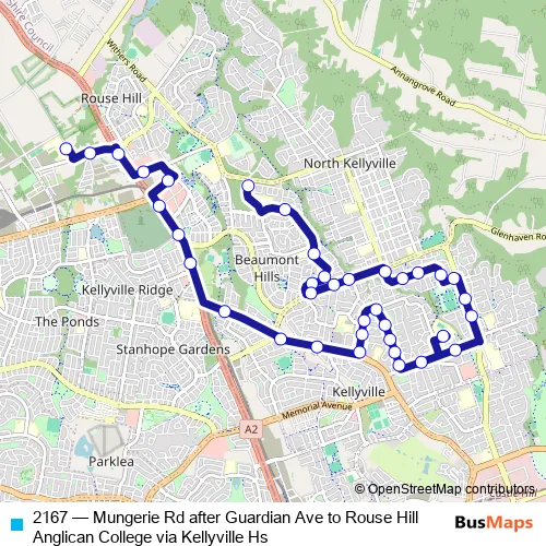 The first stop of the 2167 bus route is Mungerie Rd After Guardian Av and the last stop is Rouse Hill Anglican College. 2167 (Mungerie Rd after Guardian Ave to Rouse Hill Anglican College via Kellyville Hs) is operational during on weekdays.