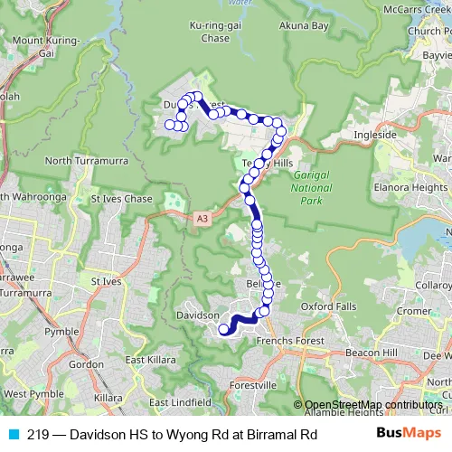 The first stop of the 219 bus route is Davidson High School, Mimosa St and the last stop is Wyong Rd At Birramal Rd. 219 (Davidson HS to Wyong Rd at Birramal Rd) is operational during on weekdays.