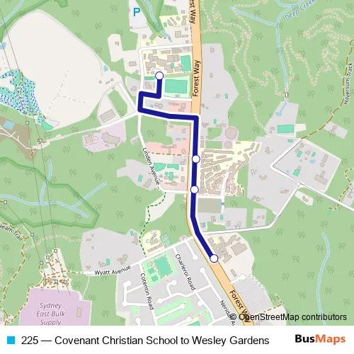 The first stop of the 225 bus route is Covenant Christian School, Dell St and the last stop is Wesley Gardens, Forest Way. 225 (Covenant Christian School to Wesley Gardens) is operational during on weekdays.