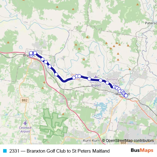 The first stop of the 2331 bus route is Branxton Golf Club, Cessnock Rd and the last stop is St Peters Maitland, High St. 2331 (Branxton Golf Club to St Peters Maitland) is operational during on weekdays.