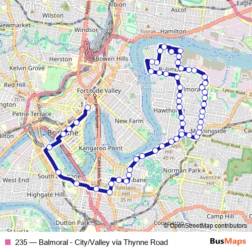 The first stop of the 235 bus route is Ann Street Stop 220 at All Hallows and the last stop is Wynnum Rd at Balmoral Cemetery, stop 23. 235 (Balmoral - City/Valley via Thynne Road) is operational during everyday.