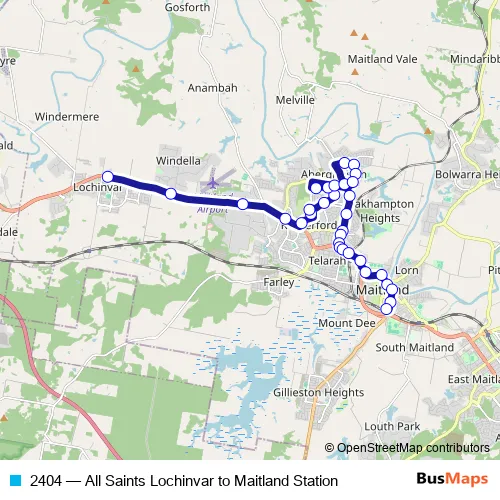 The first stop of the 2404 bus route is St Joseph's College, New England Hwy and the last stop is Maitland Station, Railway St. 2404 (All Saints Lochinvar to Maitland Station) is operational during on weekdays.