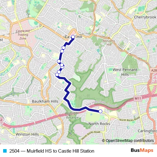 The first stop of the 2504 bus route is Muirfield High School, Barclay Rd and the last stop is Castle Hill Station, Old Northern Rd, Stand B. 2504 (Muirfield HS to Castle Hill Station) is operational during on weekdays.