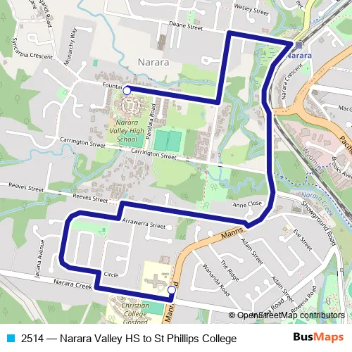 The first stop of the 2514 bus route is Narara Valley High School, Fountains Rd and the last stop is Glenvale School, Manns Rd. 2514 (Narara Valley HS to St Phillips College) is operational during on weekdays.