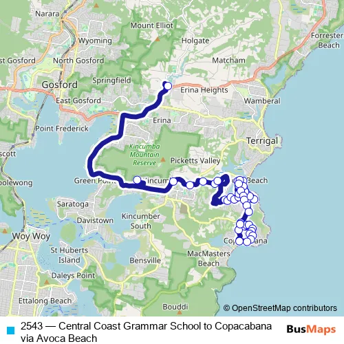 The first stop of the 2543 bus route is Central Coast Grammar, School Grounds and the last stop is Copacabana Dr At Cullens Rd. 2543 (Central Coast Grammar School to Copacabana via Avoca Beach) is operational during on weekdays.