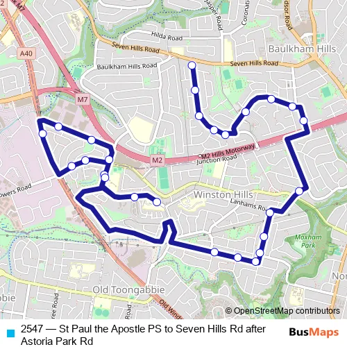 The first stop of the 2547 bus route is St Paul The Apostle Primary School, Buckleys Rd and the last stop is Cropley Dr Before Seven Hills Rd. 2547 (St Paul the Apostle PS to Seven Hills Rd after Astoria Park Rd) is operational during on weekdays.