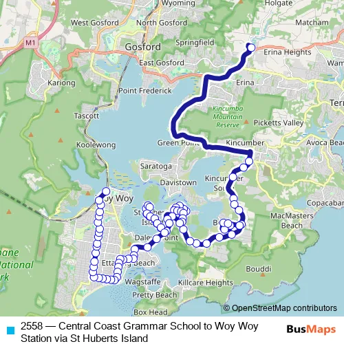 The first stop of the 2558 bus route is Central Coast Grammar, School Grounds and the last stop is Woy Woy Station. 2558 (Central Coast Grammar School to Woy Woy Station via St Huberts Island) is operational during on weekdays.