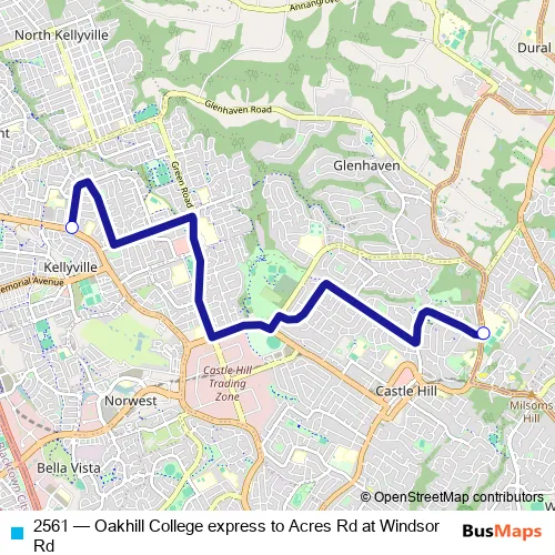 The first stop of the 2561 bus route is Oakhill College, Old Northern Rd and the last stop is Acres Rd At Windsor Rd. 2561 (Oakhill College express to Acres Rd at Windsor Rd) is operational during on weekdays.