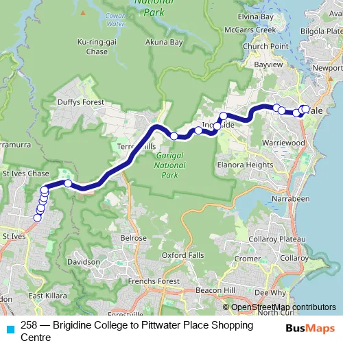 Bus 258 - Brigidine College to Pittwater Place Shopping Centre in Sydney: Stops & Timetable