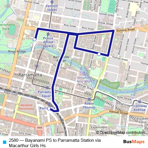 The first stop of the 2580 bus route is Bayanami Public School, Marist Pl and the last stop is Parramatta Station, Stand B4. 2580 (Bayanami PS to Parramatta Station via Macarthur Girls Hs) is operational during on weekdays.