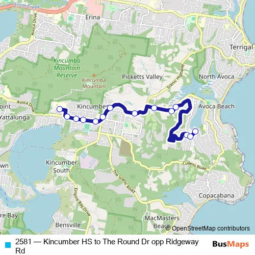 The first stop of the 2581 bus route is Kincumber St Opp Kincumber High School and the last stop is The Round Dr Opp Ridgeway Rd. 2581 (Kincumber HS to The Round Dr opp Ridgeway Rd) is operational during on weekdays.