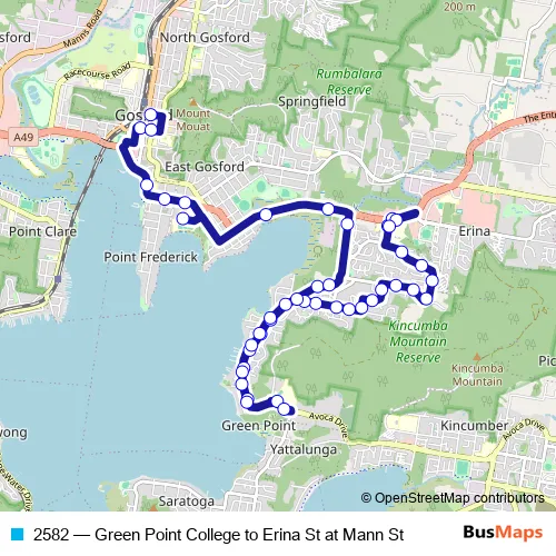 Click here to view the nearest 2582 - Green Point College to Erina St at Mann St bus stop.