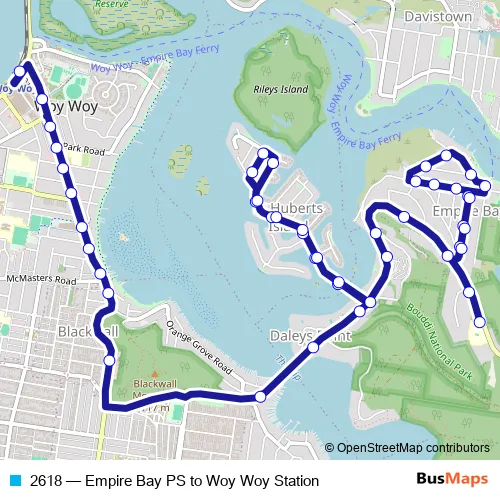 The first stop of the 2618 bus route is Empire Bay Public School, Empire Bay Dr and the last stop is Woy Woy Station. 2618 (Empire Bay PS to Woy Woy Station) is operational during on weekdays.