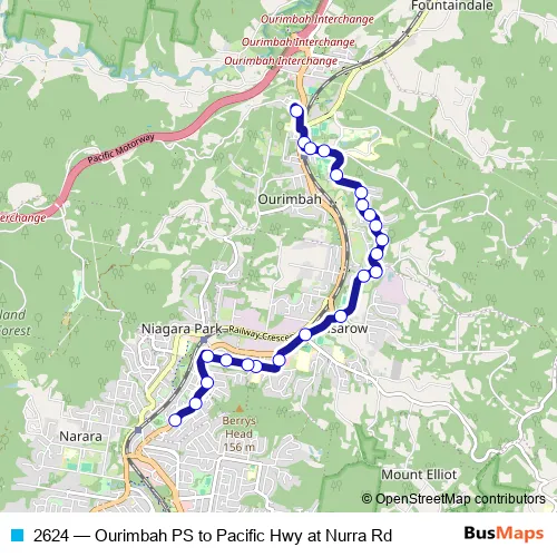 The first stop of the 2624 bus route is Ourimbah Public School, Dog Trap Rd and the last stop is Pacific Hwy At Nurra Rd. 2624 (Ourimbah PS to Pacific Hwy at Nurra Rd) is operational during on weekdays.