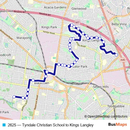 The first stop of the 2625 bus route is Tyndale Christian School, Bus Bay, Douglas Rd and the last stop is Joseph Banks Dr Before Plymouth Cres. 2625 (Tyndale Christian School to Kings Langley) is operational during on weekdays.