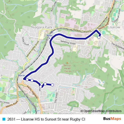 The first stop of the 2631 bus route is Lisarow High School and the last stop is Sunset St Opp Rugby Cl. 2631 (Lisarow HS to Sunset St near Rugby Cl) is operational during on weekdays.