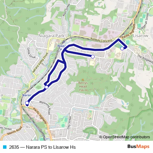 The first stop of the 2635 bus route is Narara Public School, Newling St and the last stop is Lisarow High School. 2635 (Narara PS to Lisarow Hs) is operational during on weekdays.