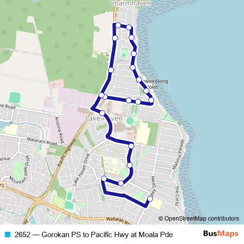 The first stop of the 2652 bus route is Gorokan Public School, Dudley St and the last stop is Pacific Hwy At Moala Pde. 2652 (Gorokan PS to Pacific Hwy at Moala Pde) is operational during on weekdays.