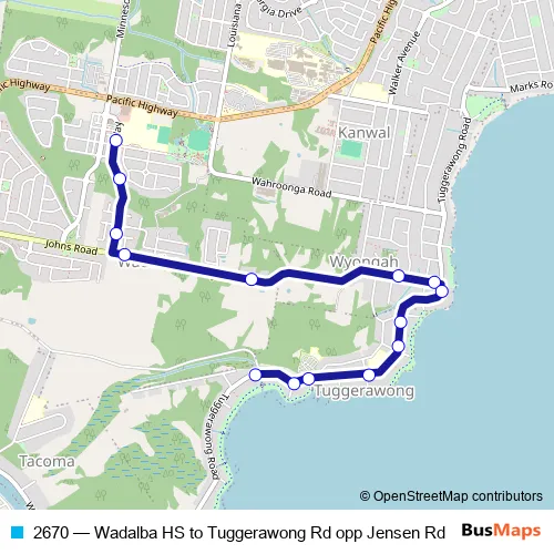 The first stop of the 2670 bus route is Wadalba Community School, Orchid Way and the last stop is Tuggerawong Rd Opp Jensen Rd. 2670 (Wadalba HS to Tuggerawong Rd opp Jensen Rd) is operational during on weekdays.