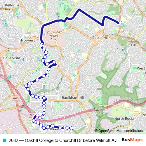 The first stop of the 2682 bus route is Oakhill College, Old Northern Rd and the last stop is Churchill Dr Before Willmott Av. 2682 (Oakhill College to Churchill Dr before Wilmott Av) is operational during on weekdays.