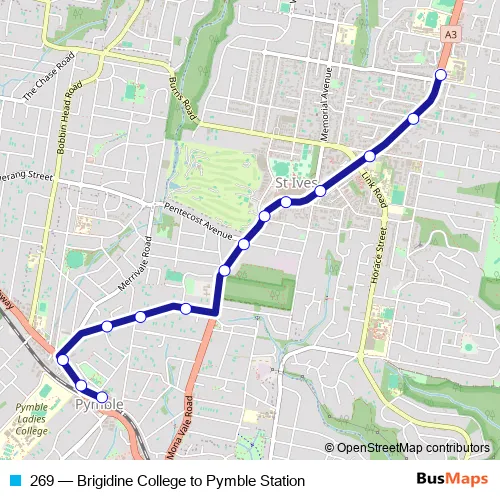 The first stop of the 269 bus route is Brigidine College, Mona Vale Rd and the last stop is Grandview St Opp Pymble Station. 269 (Brigidine College to Pymble Station) is operational during on weekdays.