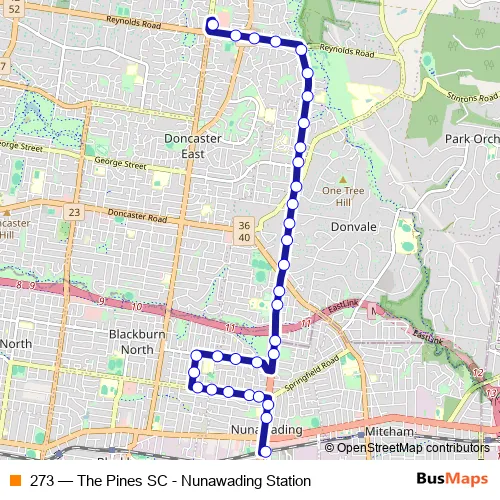 The first stop of the 273 bus route is The Pines SC/Reynolds Rd and the last stop is Nunawading Station/Station St. 273 (The Pines SC - Nunawading Station) is operational during everyday.