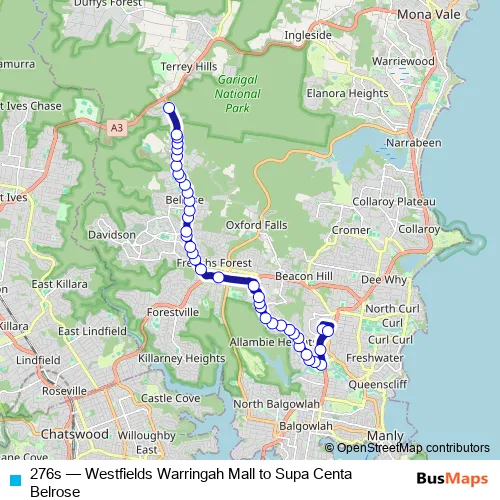 The first stop of the 276s bus route is Warringah Mall, Green St and the last stop is Forest Way At Garigal Rd. 276s (Westfields Warringah Mall to Supa Centa Belrose) is operational during on weekdays.