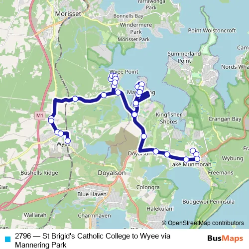 The first stop of the 2796 bus route is St Brigid's Catholic College, Carters Rd and the last stop is Wyee Rd Opp Wyee Station. 2796 (St Brigid's Catholic College to Wyee via Mannering Park) is operational during on weekdays.